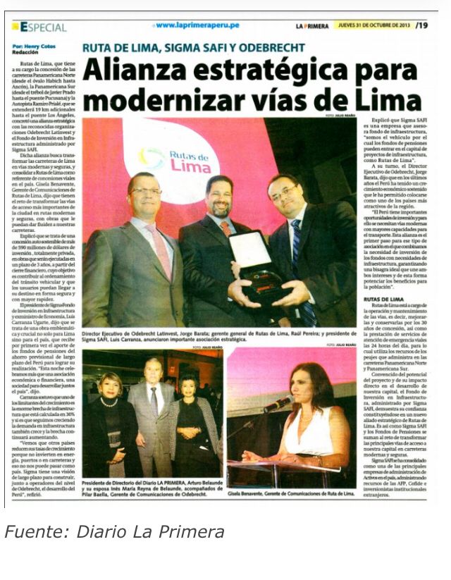 Luis Carranza representa a la empresa Sigma Capital (parte de Sigma Safi que administra del dinero de las AFPs incluyendo AFP Prima del Banco de Crédito del Perú). Sigma es accionista de Rutas de Lima (junto con Odebrecht) la cual ganó la disputa contra la Municipalidad de Lima por el asunto de los peajes. Informe de Sigma, de Luis Carranza, presentado a la Superintendencia de Mercado de Valores, mayo 2021