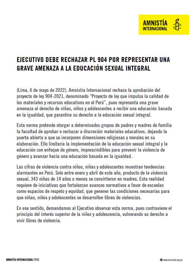 Estas discrepancias en el tema de la educación sexual en los colegios también se han notado en el Perú mediante el pronunciamiento de diversas organizaciones de la sociedad civil, defensoras de Derechos Humanos, como por ejemplo, mediante el pronunciamiento de Amnistía Internacional, quienes califican el PL aprobado por el Congreso peruano como “una grave amenaza a la Educación Sexual Integral”. Les Invitamos a considerar las evidencias presentadas y promover el debate amplio, informado y diverso.